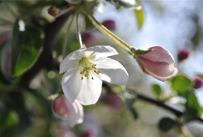 Apfelbäume benötigen andere Apfelsorten als sogenannte Befruchter. Hierfür eignen sich viele Apfelsorten, die zur selben Zeit blühen. In vielen Fällen befinden sich weitere passende Apfelbäume in Nachbargärten der Umgebung. Möglich sind auch Zieräpfel als Befruchter oder sogenannte Familienbäume. Als Familienbaum bezeichnet man spezielle Veredelungen, bei denen mehrere Apfelsorten in einem Apfelbaum kultiviert sind. Baumschulen bieten zum Beispiel veredelte Familienbäume an, bei denen eine Sommerernte, Herbstäpfel und spät im Jahr Winteräpfel eingefahren werden können. Ein Befruchter ist bei Familienbäumen nicht notwendig. Einen neuen Apfelbaum pflanzt man am besten im Herbst, ab Oktober. Dieser Pflanzzeitpunkt garantiert, dass die Bäume bis zum Frühjahr ausreichend starke Wurzeln bilden können. Das Pflanzloch sollte aufgelockert und mindestens doppelt so groß sein, wie der Wurzelballen des Apfelbaums.