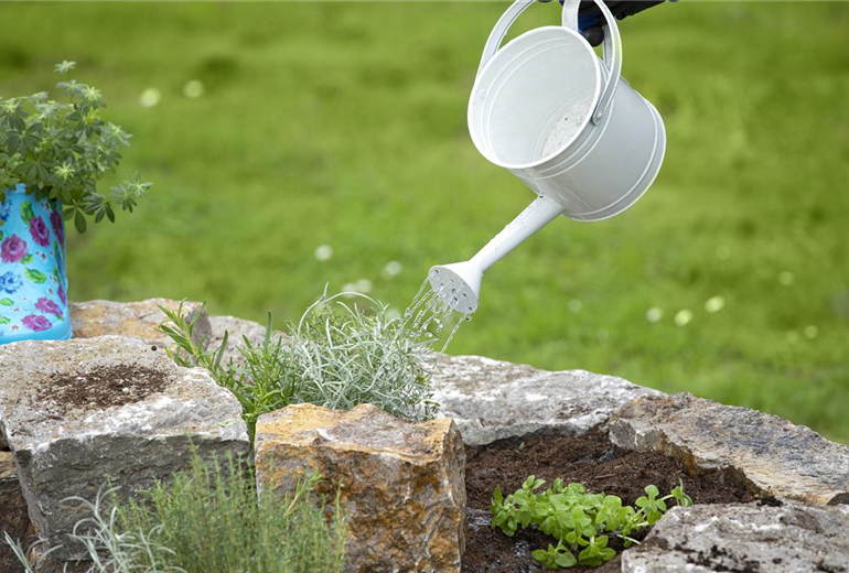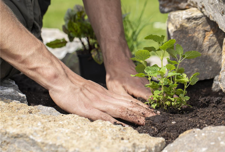 Eine Kräuterspirale lässt sich in vier Zonen aufteilen. Die unterste Zone ist für Kräuter geeignet, die es feucht mögen und auch einmal nasse Füße vertragen können. In diese Zone sollte man eine Mischung aus 50 Prozent Gartenerde und 50 Prozent Kompost ausbringen. Hier fühlen sich Brunnenkresse und Wasserminze wohl. Die zweite Zone ist ebenfalls eine eher feuchte Zone, deren Substrat aus 50 Prozent Gartenerde, 20 Prozent Sand und 30 Prozent Kompost bestehen sollte. Sie ist ideal für Pflanzen wie Bärlauch, Estragon, Basilikum, Dill, Melisse, Petersilie und Liebstöckel. In der dritten Zone gedeihen die meisten Minzarten, Schnittlauch, Koriander, Kapuzinerkresse, Borretsch und ähnliche Kräuter am besten. Sie sollte mit einem Gemisch aus 50 Prozent Gartenerde, 30 Prozent Sand und 20 Prozent Kompost aufgefüllt werden. Der obere Bereich ist den mediterranen Kräutern vorbehalten, die es warm und trocken mögen. In der Erde aus 50 Prozent Gartenerde und 50 Prozent Sand gedeihen Currykraut, Lavendel, Oregano, Thymian, Rosmarin, die meisten Salbeiarten, Majoran, Lorbeer und weitere mediterrane Kräuter bestens.