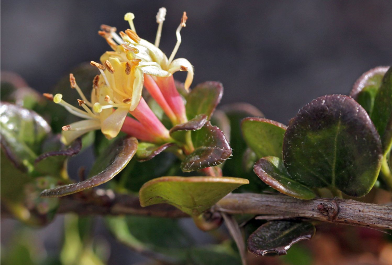 Die Kriechende Heckenkirsche 'Little Honey' bevorzugt einen Standort im lichten Halbschatten. Auch Sonne ist für ihre kräftige Entwicklung gut, wenn sie nicht zu prall und ausdauernd auf die Blätter scheint. Im Herbst überzieht ein leichtes Rot die ovalen Blätter der Pflanze. Das rötlich umrahmte Laub, das selbst im Winter Farbe zeigt, ist der wahre Schmuck von Lonicera crassifolia 'Little Honey'.