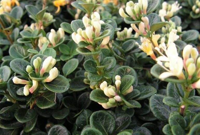 Ab Juli hüllt sich die Lonicera crassifolia 'Little Honey' mit kleinen Blüten ein. Sie erscheinen in einem weißen, leicht gelblich changierenden Ton und bilden einen niedlichen Kontrast zum dunklen Laub. Auf den ersten Blick sind die Blütenköpfchen unscheinbar. Die Aufmerksamkeit des Gärtners erregen sie durch ihren zauberhaften Duft. Das Aroma der kleinen Blüten erinnert an Honig. Lieblich süß duftend, reichert das herrliche Bouquet die Sommerluft rund um den Standort von Lonicera crassifolia 'Little Honey' an. Bis in den August hinein blüht der fleißige Bodendecker. Danach erscheinen kleine schwarze Früchte.