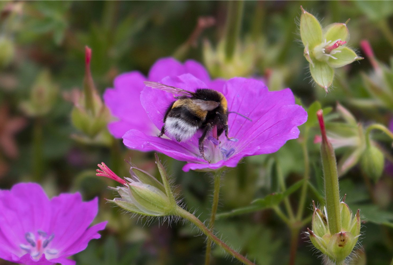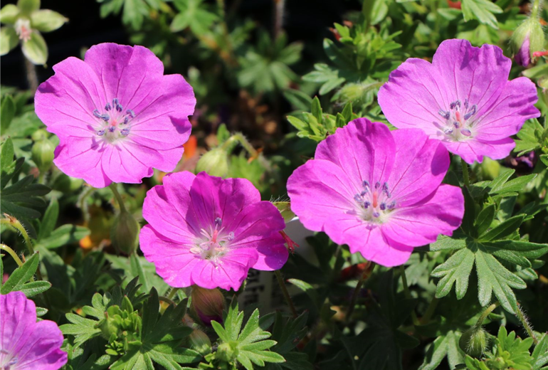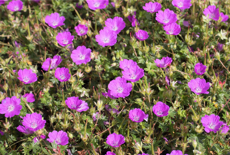 Die Pflanze bildet bezaubernde, tiefgrüne Pflanzenteppiche, gesprenkelt von vielen purpurroten Blüten. Dieser wundervolle Farbkontrast bringt dem Blut-Storchschnabel 'Max Frei' bewundernde Blicke ein. An warmen Tagen entströmt den Blättern ein zarter Duft. Seine Blätter leuchten in Orangerot und ergänzen die Farbpalette von Sträuchern und Bäumen. Er harmoniert mit krautigen Stauden am Gehölzrand, verbindet harmonisch verschiedene Blütenstauden in Rabatten und bildet einen schönen Abschluss an Rasenflächen und Beeten. Geranium sanguineum 'Max Frei' entwickelt sich über dem Wurzelbereich von Sträuchern und Bäumen zu einem wunderbaren, ausdauernden Bodendecker.