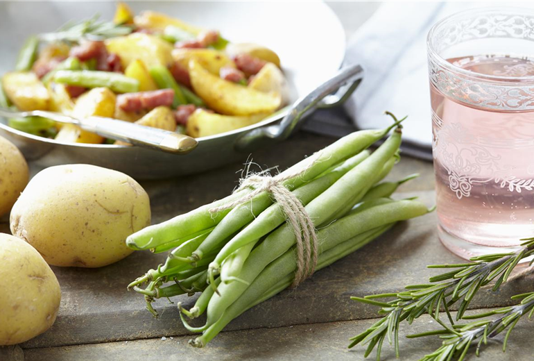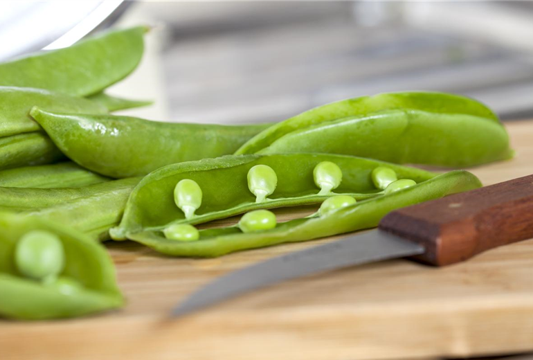 Bohnen & Erbsen. Bohnen (Phaseolus vulgaris) und Erbsen (Pisum sativum) reiften schon in Großmutters Garten und erleben aktuell ein tolles Comeback. Zu Recht, denn sie sind kinderleicht anzubauen und schmecken frisch gepflückt (ohne Lagerzeit) einfach am besten! Man unterscheidet Stangen-, Busch und Dicke Bohnen, Zucker-, Mark- und Schalerbsen. Da es sich um traditionsreiches Gemüse handelt, ist die Sortenvielfalt riesig. Buschbohne ’Prinzessa’ überzeugt durch zarte Konsistenz, während ’Purple Teepee’ mit seiner violetten Färbung auch ein Augenschmaus ist. Die gelbe Wachsbohne ’Golddukat’ ist schmal, fadenlos und bleibt lang zart. Besonders fleischig ist die gelbe Stangenbohne ’Neckargold’. Die Zuckererbsen ’Delikata’ und ’Sugar Bon’ macht ihrem Namen Ehre, während die Markerbse ’Grandera’ bei hohem Ertrag ohne Haltedraht auskommt. Die dunkelviolette Schalerbse ’Blauwschokker’ , auch Kapuzinererbse genannt, ist eine alte Sorte mit rustikalem Charakter. Die Aussaat erfolgt bei Bohnen und Erbsen direkt ins Beet; die meisten Sorten benötigen ein Rankgerüst – das kann auch der Maschendrahtzaun zum Nachbarn sein.